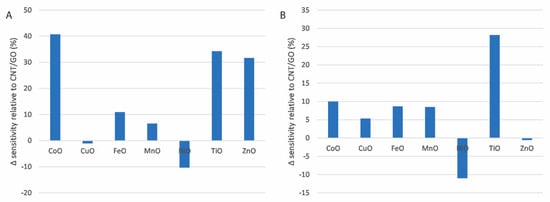 Change in sensitivities for each electrode as a percentage relative to CNT/GO for each metal oxide for (A) oxidation scan and (B) reduction scan.