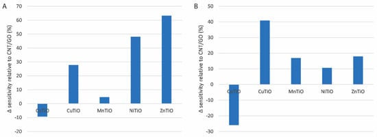 The sensitivities for sensors prepared with each of the CNT/GO/MONP nanocomposites are shown, relative to the equivalent for electrodes functionalised with only a mixture of carbon nanotubes and graphene oxide, in Figure 6. The sensitivities for the oxidation reactions are shown in Figure 6A and the equivalent values for the reduction reaction are shown in Figure 6B. Nanomaterials can enhance sensor performance by increasing the surface area of the electrode, improving electron transfer and catalytic effects. Any improvements to surface area or electron transfer are likely to be modest when compared to that of the carbon nanotube/graphene oxide mixture [49], so displaying the sensitivities relative to a CNT/GO electrode is an effective way of isolating the catalytic effects of the metal oxide nanoparticles. It can be seen from Figure 6A that, for the oxidation scan, cobalt oxide nanoparticles impart the greatest improvement in sensitivity with an approximately 40% increase compared to CNT/GO, followed by titanium oxide and zinc oxide at approximately 34% and 32%, respectively. Iron oxide and manganese oxide impart a modest improvement, and copper oxide and nickel oxide result in a decrease in sensitivity, most likely as a result of a combination of low catalytic activity, coupled with a reduction in the total effective area of available graphene oxide. In the case of the reduction scan, it can be seen from Figure 6B that titanium oxide nanoparticles impart the greatest improvement in sensitivity at approximately 28%, compared to approximately 10% or lower for the oxides of cobalt, copper, iron and manganese and decreases in sensitivity for nickel oxide and zinc oxide. From this, it can be concluded that, of the single metal oxides investigated, titanium oxide is the most promising for this dual scan technique.