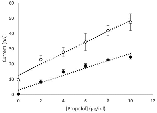 Peak current versus propofol concentration at +460 mV for the oxidation scan (black circles) and −60 mV for the reduction scan (white circles) for CNT/GO/CuTiO electrodes in spiked bovine serum. Baseline correction has been applied and the error bars represent one standard deviation (N = 3).