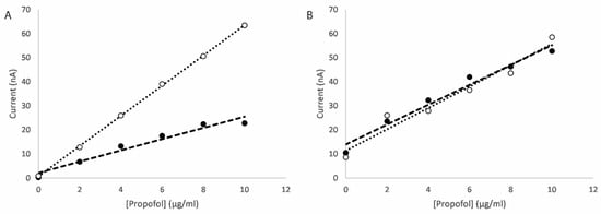 Peak current against propofol concentration for (A) the oxidation scan (at +460 mV) and (B) the reduction scan (at −60 mV) for bovine serum samples spiked with propofol (black circles) and with a mixture of propofol and paracetamol (white circles). The paracetamol concentration is 2.5 times that of the propofol concentration.