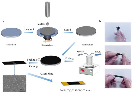 The MWCNTs (diameter = 3–15 µm, average length = 15–30 µm, and >95% purity) were provided by Hongdakang Evolution Technology Co., Ltd., Shenzhen, China. The MXene was provided by Guangdong Foshan Xinxi Technology Co., Ltd., Guangdong, China. The Ecoflex (00–30) was purchased from Smooth-on Co., Ltd., Macungie, PA, USA.