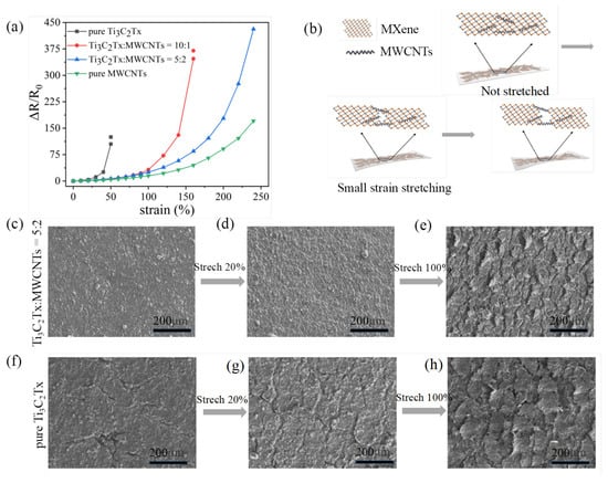 (a) The relationship between the resistance change and deformation characteristics of strain sensors with different doping ratios. (b) Fracture mechanism of the Ecoflex/Ti3C2Tx/MWCNT strain sensor. (c–e) Top-view SEM images of the Ti3C2Tx:MWCNT = 5:2 strain sensor during stretching. (f–h) Top-view SEM images of the pure Ti3C2Tx strain sensor during stretching.