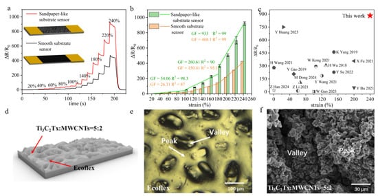 (a) Real-time response curves of sandpaper-like substrate and smooth substrate sensors under 0–240% step strain. (b) Sensitivities of sandpaper-like substrate and smooth substrate sensors at different strain stages. (c) A comparison of the highest gauge factor and the maximum working range of the strain sensors with that of the previously reported strain sensors [,,,,,,,,,,,,,]. (d) A microscopic diagram of the sandpaper structure. (e) A light microscope image of an Ecoflex substrate with a sandpaper structure. (f) An SEM image of the surface of the Ecoflex/Ti3C2Tx/MWCNT sensor with a sandpaper structure.