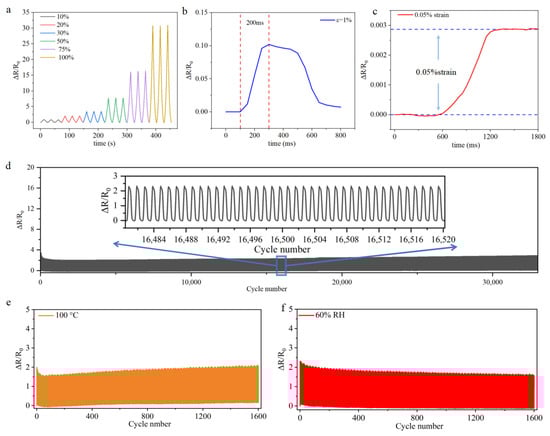 Moreover, durability tests are also performed under high temperatures and in wet environments, in which 1600 cycles are applied to research the sensor performance adequately. Since both the conductive material and the base material are heat-resistant materials, the sensor still maintains good stability and durability at 100 °C under high temperature heating, as shown in Figure 4e. In addition, due to the good packaging of the sensor, it can avoid the adverse effects of a wet environment. When the sensor is subjected to a two-hour exposure in a 60% relative humidity (RH) environment and subsequently evaluated for durability, it continues to exhibit superior stability.