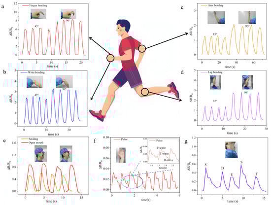 These qualities render this Ecoflex/Ti3C2Tx/MWCNT strain sensor highly suitable for practical applications, such as the real-time monitoring of human vital signs and the capturing of minor body movements in wearable flexible sensors. Therefore, the impressive 240% strain range makes it highly effective in detecting joint bending movements. The collected signals accurately capture human body movements and physiological signals, as depicted in Figure 5. Figure 5a–d describes the relative resistance of the index finger, wrist, arm, and leg at flexion angles of 45° and 90°, wherein the results clearly demonstrate the sensor’s ability to accurately differentiate between these different body parts’ degrees of flexion while exhibiting remarkable stability. Notably, significant and regular changes in resistance response are detected at four different joint locations. These results strongly validate the sensor’s capacity to detect major joint bending movements in the human body. Moreover, the sensor exhibits an impressive ultra-low detection limit of 0.05%, which can be effectively used for subtle change or small strain detection in the human body. For instance, Figure 5e shows that the resistance changes regularly and steadily during repeated opening and closing of the mouth, which is measured with the sensor attached to the face. When smiling, the periodic change in resistance can also be clearly detected. Meanwhile, the resistance change while smiling is obviously less than that while opening the mouth, which coincides with the actual smile and mouth opening movement amplitudes. Thus, these types of subtle changes in the human body can be distinguished easily. Additionally, another potential application in healthcare involves small strain detection, which can be placed at the pulse point to monitor pulse signals. Pulse detection is conducted in Figure 5f, where pulse signals are acquired with three waves. The P, T, and D waves are distinguished and consistent with the waveform of the output signals in the relevant study [], proving the effectiveness of our sensors in healthcare. The detected heart rate from the subject, approximately 75 beats per minute under normal conditions, is closely aligned with the rate detected by the sensor, underscoring the sensor’s high sensitivity and real-time detection capabilities, demonstrating excellent performance even in detecting minute strain variations. Consequently, this sensor holds immense potential for providing rapid and non-invasive diagnostic methods in the healthcare industry. Furthermore, the sensor is positioned on the throat to monitor changes during various pronunciations. The resistance change curves obtained during the pronunciation of “S D U S T” (Figure 5g) clearly distinguish the pronunciation of different letters. Additionally, the resistance change curves for the two instances of pronouncing “S” are nearly identical, indicating that the sensor can not only differentiate between different letter pronunciations but also classify similar pronunciations. This remarkable speech recognition ability of the sensor opens up significant applications in speech rehabilitation training and voice control. These results show that this sensor has a remarkable capability to detect both major joint movements and subtle changes in human body.