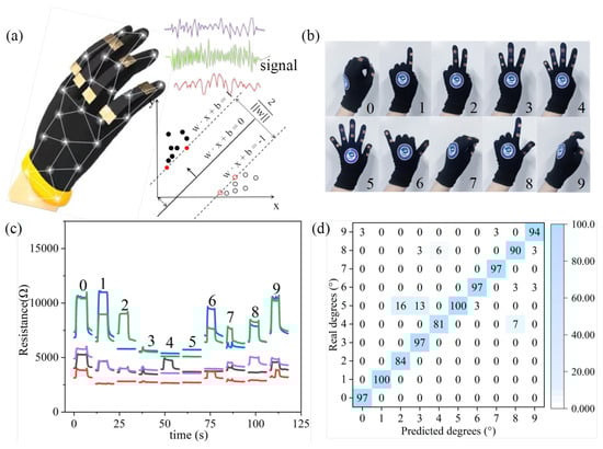 (a) A conceptual diagram of the designed data glove. (b) An actual image of the data glove displaying “0”–“9,” representing ten different gestures. (c) The resistance change waveforms collected for the “0”–“9” gestures. (d) The confusion matrix of the prediction results using the SVM model.
