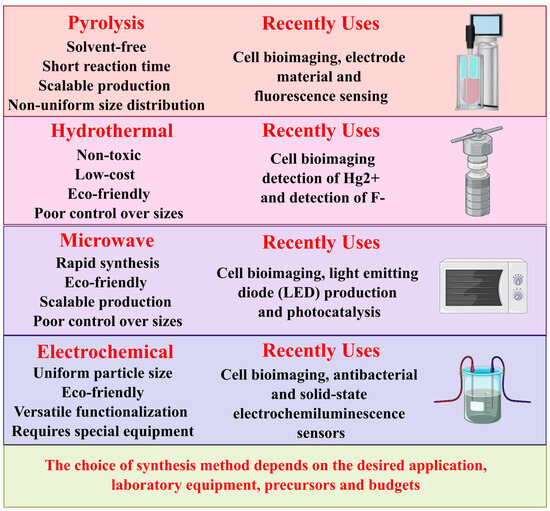 Figure 2. Synthesis techniques for carbon-based nanomaterials: recent applications and key features.