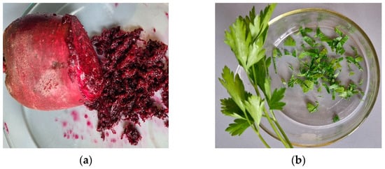 The extracts were prepared using red beet (Beta vulgaris L.) and parsley leaves (Petroselinum crispum L.) from a local field in the Wielkopolska region (Poland). After washing with warm water, a red beet without previous peeling was ground on a vegetable grater and the parsley leaves were cut manually into smaller pieces (Figure 1).