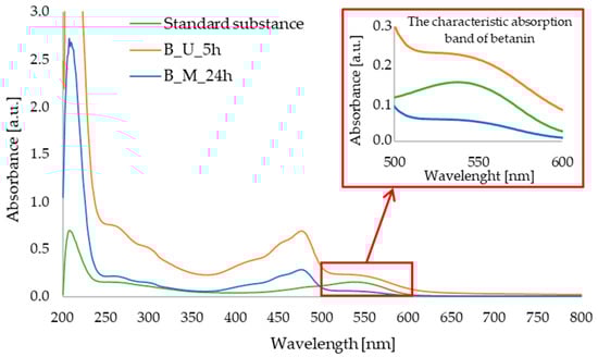Qualitative UV–Vis analysis allowed us to confirm the presence of betanin in the red beet extracts obtained. In Figure 2, an absorption band can be observed at a wavelength of approximately 538 nm for the standard substance and the red beet extract obtained using the ultrasound-assisted method. On the other hand, this band for the extract obtained with 24 h of maceration is not very intense. The maximum absorption of betanin has already been determined by the research group of Xu [] and Yang [], among others.