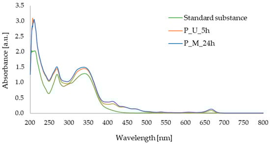 UV–Vis spectra for: standard substance (apigenin); parsley leaf extract obtained after 5 h of ultrasound-assisted extraction (P_U_5h); parsley leaf extract obtained after 24 h of maceration (P_M_24h).