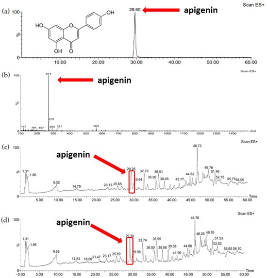 Comparison of the results obtained for the standards of active substances, namely apigenin and betanin, allowed the identification of these compounds in the plant extracts obtained. Figure 4b shows the ESI+/MS spectrum for the apigenin standard (apigenin mass: 270.24 Da). A pseudomolecular ion ([M-H]+) with a m/z value of 271 was observed and the retention time for the apigenin standard was approximately 30 min (Figure 4a). Based on the comparison of the retention time of apigenin in standard solution, the presence of the active substance was confirmed in the parsley extracts obtained using both extraction methods (Figure 4c,d).