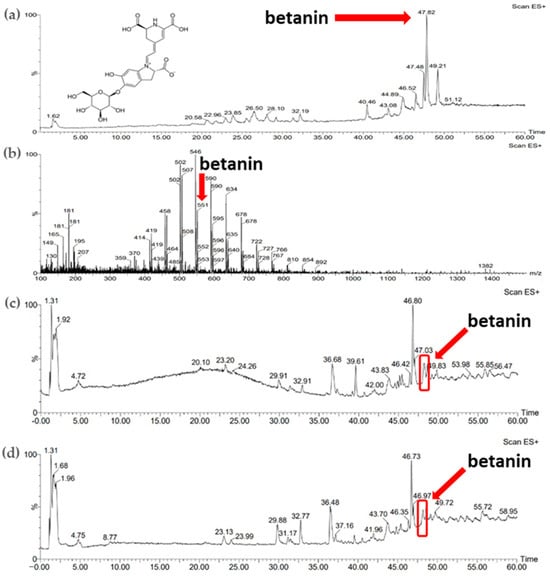 Figure 5b shows the ESI+/MS spectrum for the betanin standard (betanin mass: 550.49 Da). A pseudomolecular ion ([M-H]+) with a m/z value of 551 was observed (Figure 5b). The retention time of this compound determined from the chromatogram (Figure 5a) was approximately 47 min. Comparison of the retention time of the betanin standard with the chromatograms of plant extracts allowed the identification of betanin in the samples studied obtained using both extraction methods (Figure 5c,d).