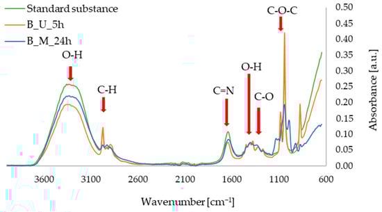 FTIR-ATR spectra for standard sample of betanin; red beet extract obtained with ultrasound-assisted procedure (B_U_5h); red beet extract obtained with 24 h of maceration (B_M_24h).