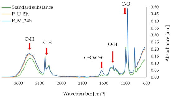 FTIR-ATR spectra for standard sample of apigenin; parsley leaf extract obtained with ultrasound-assisted procedure (P_U_5h); parsley leaf extract obtained with 24 h of maceration (P_M_24h).