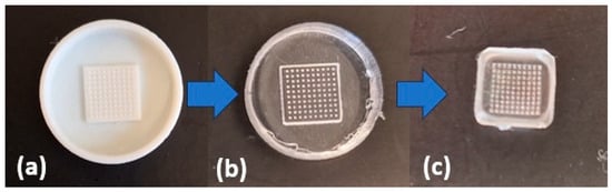 During the optimization procedures mentioned above, a substitute (Figure S1, Supplementary Materials) of the actual silicone mold was used. It had the form of a square with a size and shape that mimicked the target mold of the microneedle patch.