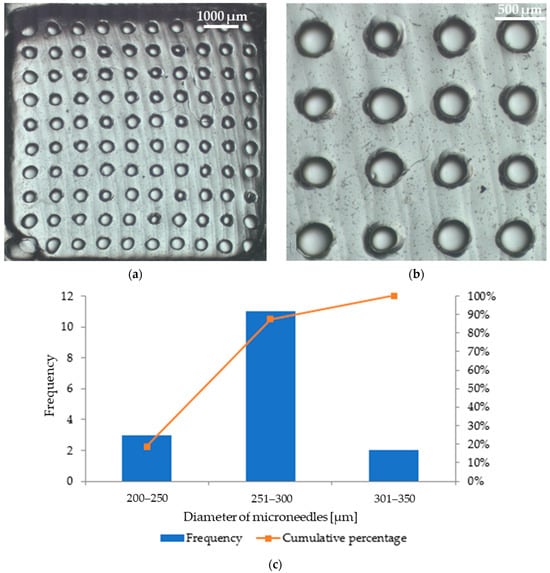 Photographs of the microneedle patch prepared with parsley leaf extract: (a) a view of the whole patch; (b) a zoom showing the arrangement of needles in the patch; (c) a histogram showing the frequency of individual microneedle diameters (based on Figure 9b).