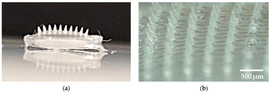 The needles formed are visible to the naked eye, as shown in Figure 11a. It can be seen that the spears are of similar length and have sharp tips. Figure 11b shows the microscopic image of the patch, depicting the alignment, length, and shape of the needles.