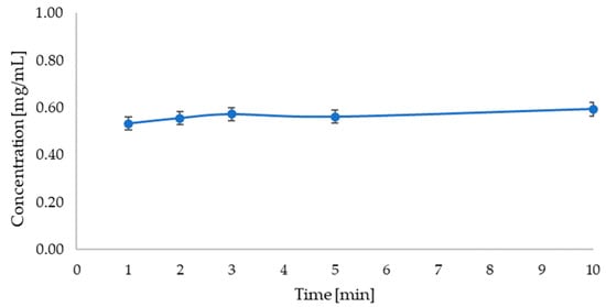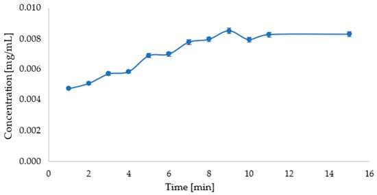 An analysis of the release of active substances from the prepared carriers showed progressive changes in concentration with time. In the case of the carrier with the parsley leaf extract, an increase in the concentration of the released apigenin can be observed during the first 9 min. After this time, the concentration of apigenin in the solution was constant, as shown in Figure 12.