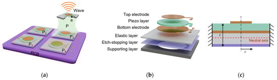 Figure 1a provides a schematic diagram of the R-PMUT, where a single PMUT consists of a supporting layer, an etch-stopping layer, an elastic layer, a bottom electrode, a piezoelectric layer, and a top electrode from bottom to top, as shown in Figure 1b. Applying voltage between the top electrode and the bottom electrode generates radial force in the piezoelectric layer. The vibrating diaphragm operates in the flexural vibration mode of d31 and generates pressure longitudinal waves. Due to the significant difference in the acoustic impedance between air and general objects, such as solids and liquids, most ultrasonic waves are reflected. The echo ultrasonic signal is reflected by the target object and reaches the surface of the sensor. The piezoelectric thin film converts pressure into electrical signals due to the piezoelectric effect. Then, the system measures the distance of the object based on the ToF principle to sense the surrounding environment.