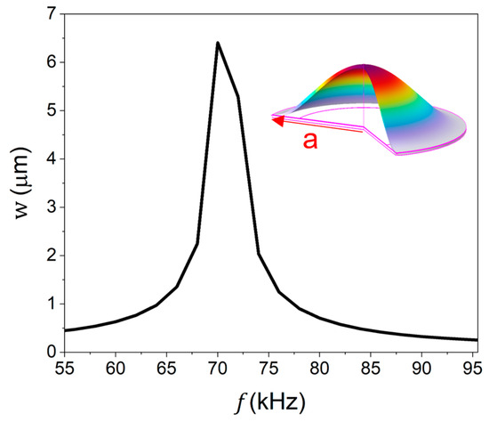 Frequency response of the PMUT: center displacement w at different frequencies (inset: first-order vibration mode, and a is the radius of the membrane).