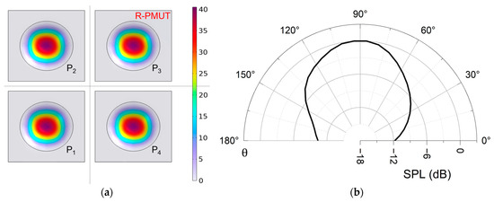 (a) First-order modal simulation of a R-PMUT, where the color of the legend represents the magnitude of the vibration amplitude, and P1–P4 are four elements of the R-PMUT; (b) simulation of directivity normalized of far-field sound pressure level (SPL) for the R-PMUT.