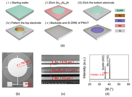 Figure 4a(i–v) shows a flowchart of the fabrication process for the latest PMUTs we have developed, as mentioned in a previous work [22]. The designed PMUT is fabricated from the piezoelectric film Sc0.2Al0.8N, which is grown on an SOI wafer (provided by Shanghai Normal University), as shown in Figure 4a(i). In addition, ii and iii involve sequentially etching the ScAlN layer using ion beam etching and the Mo layer using plasma etching, respectively, from top to bottom, to form a patterned thin film. The whole surface is sputtered with gold, and the top electrode is patterned by the lift-off process (Figure 4a(iv)). Figure 4a(v) shows the process of etching the backside of the device using deep reactive ion etching (DRIE), until it reaches the SiO2 etch-stopping layer. Here, the radius of the back cavity defines the radius of the PMUT film. Figure 4b displays an SEM image of the PMUT element fabricated with a 780 µm radius. The thickness and quality of each layer of the PMUT are shown in Figure 4c. The bright and dark light in the ScAlN layer arise due to the accumulation of charges. XRD analysis reveals the presence of a diffraction peak at approximately 36°, corresponding to the (002) orientation of the ScAIN thin film, as depicted in Figure 4d. The half-height width for this peak is approximately 0.16°. Additionally, a diffraction peak attributed to the (110) orientation of the Mo film is observed near 40°. The sharp diffraction peak of ScAlN indicates good crystal orientation and high crystal quality.