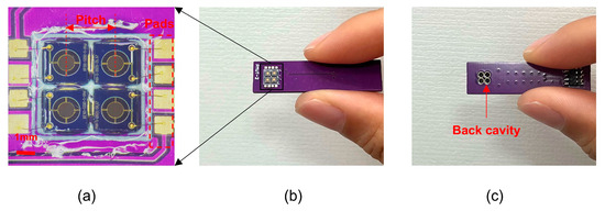 (a) Optical image of a 2 × 2 R-PMUT; (b) front of the device; (c) back of the device.