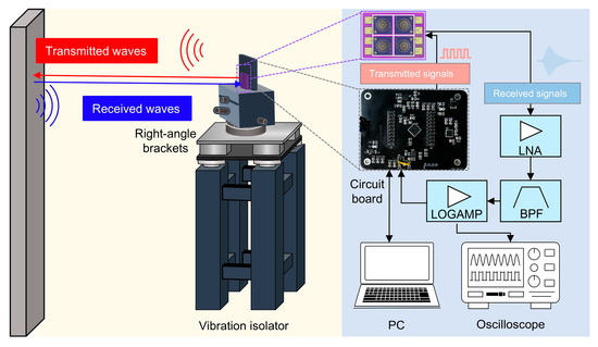 As shown in Figure 7a, the vibration amplitude of the piezoelectric thin film increases as the voltage increases, albeit with a gradual deceleration rate. Moreover, within the constraints of low power consumption, there is a limitation on the excitation voltage amplitude. Additionally, the propagation of ultrasonic waves in air exhibits exponential attenuation, resulting in a weak echo amplitude [36]. Therefore, the PMUT array is utilized as both a transmitter and receiver to mitigate the frequency mismatch between the transmitted and received signals. In addition, the circuit that captures the signal must consist of a low-noise linear amplifier, a bandpass filter, and a logarithmic gain amplifier to capture weak echo signals and provide an excellent input dynamic range over the entire range of reflected waves [37]. In this manner, a demodulated analog output representing the received echo, the zero crossing of the input signal, and a simple threshold crossing indicator all enable presence detection and considerable signal-to-noise ratio (SNR). Then, the obtained analog signals are converted into digital signals by analog-to-digital converters (ADCs) and transferred to microprogrammed control units (MCUs) or personal computers (PCs). The amplitude of signals and pertinent time information can be directly observed through an oscilloscope. The total test system is mounted on a vibration isolator to minimize interference from ambient vibration, which effectively enhances the SNR of the signal.