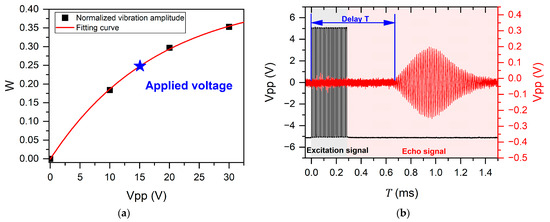 (a) Normalized vibration amplitude W of devices driven by different voltages Vpp; (b) variation of the excitation pulse signal and the echo signal with time T.