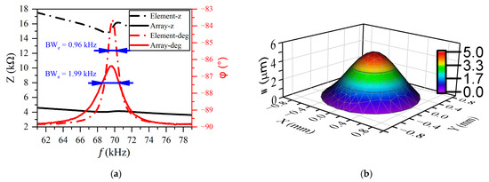 (a) Measured electrical impedance values Z and phase φ of a PMUT element and a PMUT array; (b) first-order vibration mode of the PMUT element.
