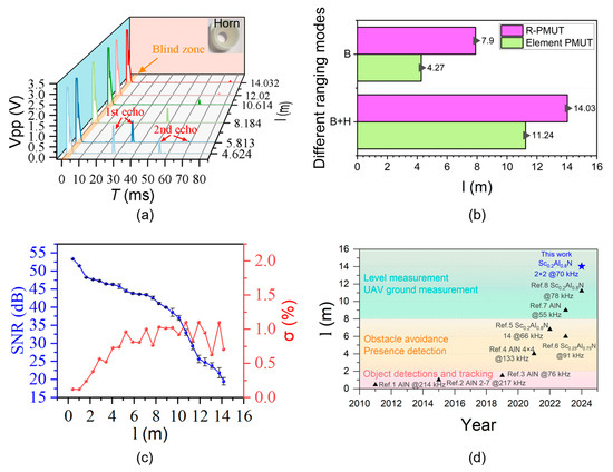 (a) Signal waveform of the R-PMUT pulse-echo signal; (b) farthest sensing distances l of the R-PMUT and element PMUT with a resonant frequency of 69 kHz (B: back cavity, H: horn); (c) signal-to-noise ratio (SNR) vs. distance: at the threshold of 19.5 dB, the maximum range of the PMUT array is 14 m (temperature: 15 °C, relative humidity: 37%); (d) comparison of the maximum sensing distances (Data are from Ref. 1 ([14]), Ref. 2 ([28]), Ref. 3 ([15]), Ref. 4 ([17]), Ref. 5 ([25]), Ref. 6 ([22]), Ref. 7 ([16]), Ref. 8 ([24])).