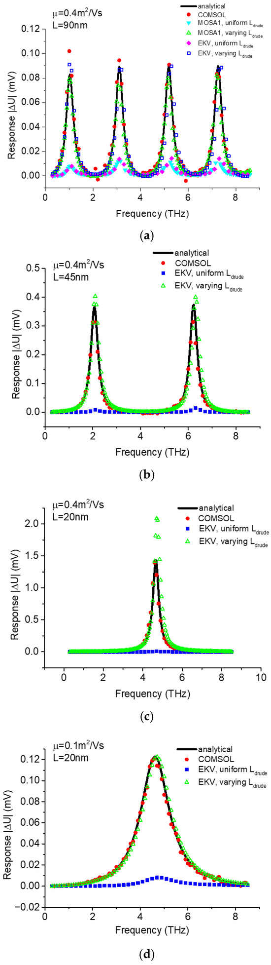 - Zhang, Y.; Shur, M.S. TeraFET terahertz detectors with spatially non-uniform gate capacitances. Appl. Phys. Lett. 2021, 119, 161104. [Google Scholar] [CrossRef]