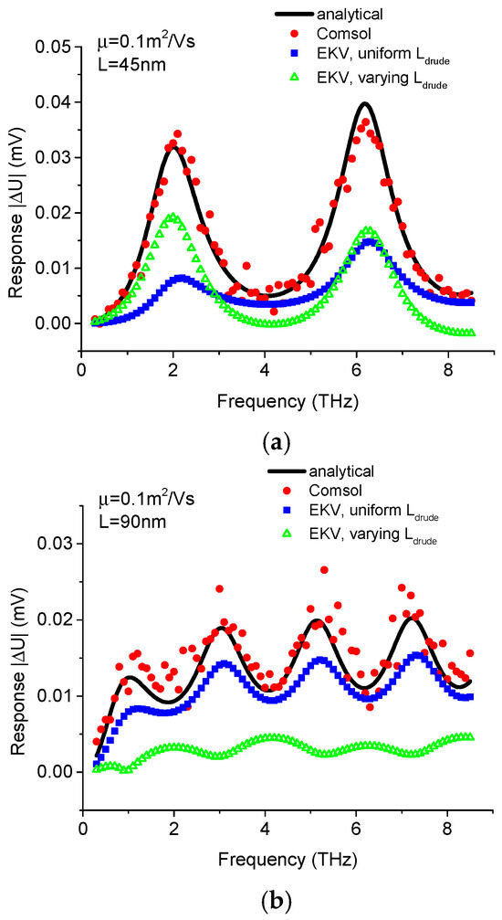 - Dyakonov, M.; Shur, M. Detection, mixing, and frequency multiplication of terahertz radiation by two dimensional electronic fluid. IEEE Trans. Electron Devices 1996, 43, 380–387. [Google Scholar] [CrossRef]