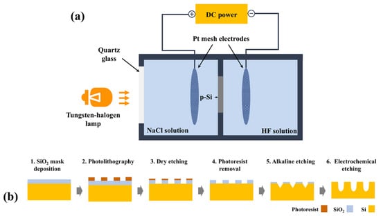 - Zhang, J.; Zhang, F.; Ma, M.; Liu, Z. Fabrication of Ordered Macropore Arrays in N-Type Silicon Wafer by Anodic Etching Using Double-Tank Electrochemical Cell. Micromachines 2024, 15, 569. [Google Scholar] [CrossRef]