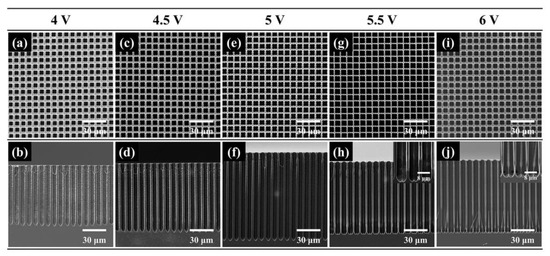 SEM images of macropore arrays fabricated on the p-type silicon with the resistivity of 50–80 Ω·cm at a voltage of (a,b) 4 V, (c,d) 4.5 V, (e,f) 5 V, (g,h) 5.5 V and (i,j) 6 V.