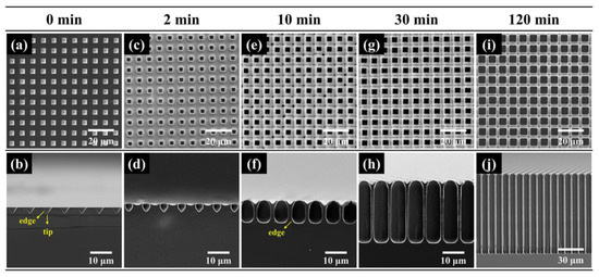 SEM images of macropore arrays etched at (a,b) 0 min, (c,d) 2 min, (e,f) 10 min, (g,h) 30 min and (i,j) 120 min. The resistivity of silicon is 50–80 Ω·cm and the etching voltage is 6 V.