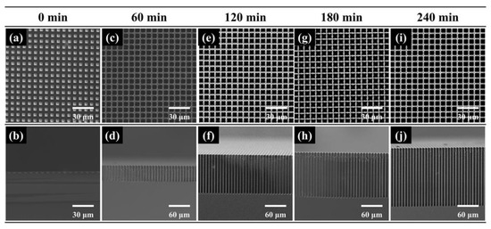 SEM images of macropore arrays etched at (a,b) 0 min, (c,d) 60 min, (e,f) 120 min, (g,h) 180 min and (i,j) 240 min. The resistivity of silicon is 50–80 Ω·cm and the etching voltage is 5 V.