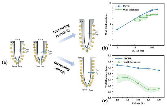 The tendency of the wall thickness variation is the same as the change in the space charge region width, and the influence mechanism on the pore diameter is shown in Figure 9a. When silicon resistivity increases, hole concentration in the bulk silicon would decrease. They would increase the difficulty of injecting holes into the pore wall, so SCRL and the wall thickness would increase and the pore diameter would decrease (see Figure 3a and Figure 9b). Meanwhile, the electric field direction generated by the etching voltage is the same as the hole diffusion direction. When the etching voltage increases, it promotes hole diffusion into the pore wall, causing a decrease in SCRL and the wall thickness, according to Figure 9c, and the pore diameter would increase according to Figure 5a.