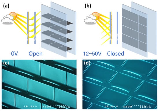 - Mori, K.; Misawa, K.; Ihida, S.; Takahashi, T.; Fujita, H.; Toshiyoshi, H. A MEMS Electrostatic Roll-Up Window Shade Array for House Energy Management System. IEEE Photon. Technol. Lett. 2016, 28, 593–596. [Google Scholar] [CrossRef]