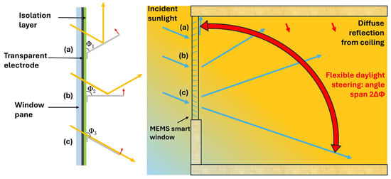 In this paper, the initial opening angle of a micromirror is the default angle, where no electrostatic voltage is applied (0 V). The micromirrors in Figure 2a–c are illustrated with tilt angles Φ of ~60°, 90°, and ~130°, respectively, and the same angled light incidence is considered for all three cases. In Figure 2c, involving Φ3 in combination with the specified light incidence, no light steering occurs, i.e., the incoming light directly reaches the floor. When the micromirror angle is at Φ1, the sunlight is reflected toward the ceiling next to the window. As the angle increases between Φ1 and Φ3, the reflected light changes over an angle span of 2ΔΦ = 2(Φ3 − Φ1), indicated by the red double arrow. This further implies the extensive reach of reflected light towards the ceiling area in deeper parts of the room. Such a range and reach demonstrate that the mirror angle span ΔΦ = Φ3 − Φ1, as illustrated in Figure 2, already covers all the situations required in practice [14,15,16].