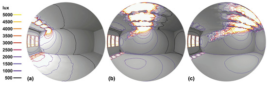 Rendered images in a fisheye lens perspective from inside a model room to display the overall impressions of the illumination distribution. (a) Light direction to ceiling parts close to the window. (b) Light direction to the middle part of the room ceiling. (c) Light direction deep inside of the room. Original from [18], with the permission of Leuze Publishing House.
