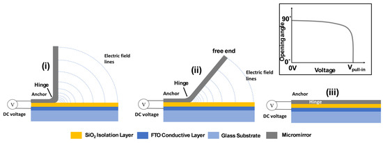 As shown in Figure 4i, the density of the electric field lines is considerably greater at the hinge area compared to in the mirror areas further away from the hinge. The local electrostatic force is proportional to the density of the electrical field lines; hence the electrostatic attraction force is stronger at the hinge part than at the outer part. These electrostatic forces enable the micromirror to tilt until it completely closes after reaching the pull-in condition. Variations in the electrostatic attraction force can be achieved by changing the applied DC voltage. The moveable mirror plane exhibits various tilt angles depending on the applied voltage. At a low DC voltage, the micromirror is in intermediate state in between (i) and (ii), i.e., slightly tilted, close to the vertical. As the voltage increases, the tilt angle decreases further until the pull-in condition is reached, where the mirror “snaps” onto the SiO2 layer and reaches the closed state, as in Figure 4iii [5,6]. The inset of Figure 4 illustrates the relationship between applied voltage (from 0 V until the pull-in voltage) and the tilt angle (from the initial 90° to 0°, describing the closing processes).
