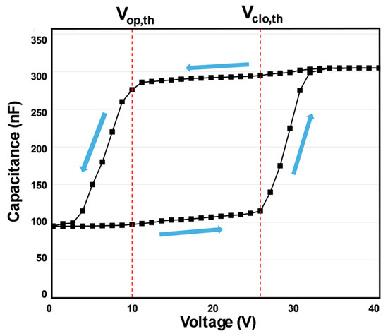 Schematic C-V profile to define the closing and reopening processes and respective threshold voltages. This schematic is obtained by averaging many experimental profiles of different designs. This averaged experimental C-V profile exhibits hysteretic behavior and also reflects the nonlinearities inherent in the actuation mechanism. The threshold voltage of the closing process is Vclo,th, and the threshold voltage of the reopening process is Vop,th. The threshold points (threshold voltages) always indicate a transition from a small slope dC/dV to a much larger one. During the closing process, the slopes dC/dV are positive, and during the reopening process, the slopes are negative. The blue arrows show the directions of a full cycle starting from the initial opening angle with the closing process and ending with reopening processes again at the initial opening angle.