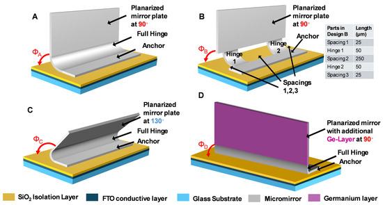Figure 7 illustrates four different micromirror designs (A–D) with differences in the designed hinge structures, initial tilt angles, and materials. All the micromirror planes are fully planarized by layer combinations with thicknesses of a few hundred nanometers. Design A is the standard design with a full hinge along its length, whereas design B has a broken hinge design feature with two short, separated hinges (hinge 1, hinge 2) that connect the mirror to the anchor. Both of the initial tilt angles ΦA and ΦB are designed to be approximatively 90°. Design C has the same full-hinge design as design A, but with a larger tilt angle ΦC of about 130°. Designs A, B, and C are fabricated using identical thicknesses in the metal layer stack (Al, Cr). The last design, design D, has exactly the same parameters as the that of A, except with a different material combination of Al, Cr, Ge (see [35] for details). The SEM micrographs of all four designs are shown in Figure 8.