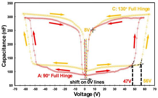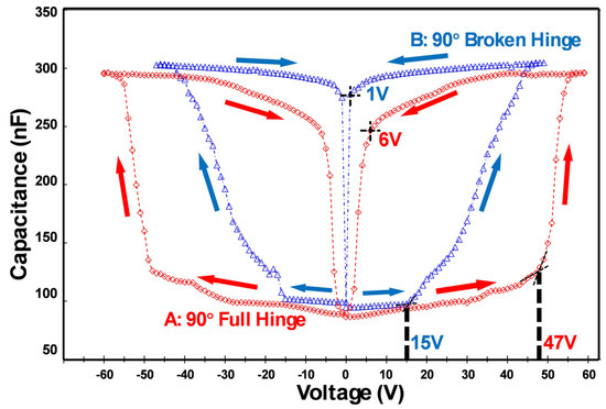 C-V curves of design A (full-hinge design with a 90° initial opening angle, red color) and design B (a broken-hinge design with a 90° initial opening angle, blue color).