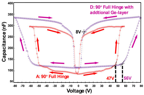 Note that the remaining parameters are kept the same as in designs A, B, and C. In Figure 11, the capacitance values of design D reveal a threshold voltage Vclo,th of 56 V. Considering the reopening process and reducing the voltage below the threshold voltage Vop,th = 8 V, the slope dC/dV dramatically increases.