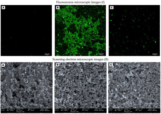 Figure 1. Fluorescence (I) and SEM (II) images of (A) bare SPCE/AuNPs, (B) aptasensor, and (C) aptasensor in the presence of 5 μM IsdA. Fluorescence images were conducted by applying 20 μL of 6-carboxyfluorescein (FAM) dye to the surface of the aptasensor.