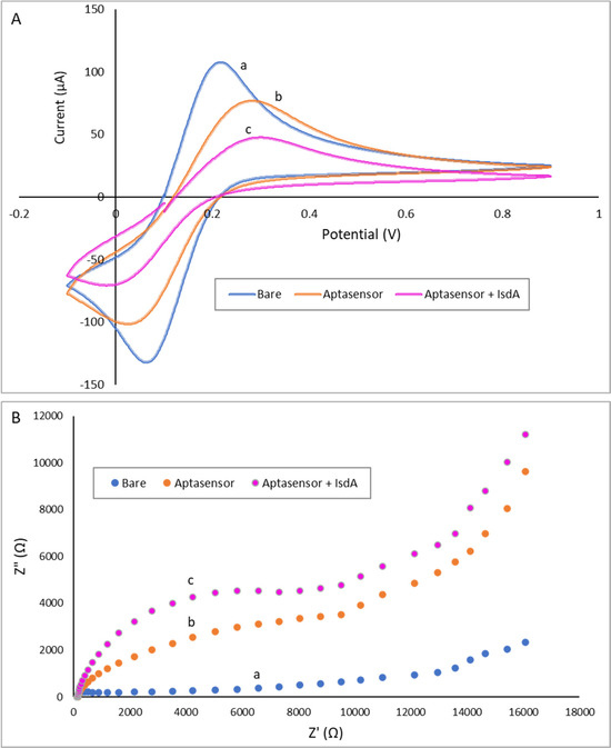 Figure 2. (A) CVs and (B) EISs of the different electrode states in the presence of 5 mM [Fe(CN)6]−3/−4 and 0.1 M KCl probe solution at a pH of 7.5, where curve (a) is related to bare SPCE/AuNPs, curve (b) is related to the aptasensor, and curve (c) is for the aptasensor in the presence of IsdA (5 μM).