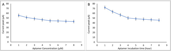 In Figure 3A, we analyzed the effect of increasing aptamer concentration on the peak current. As the aptamer concentration increases, a gradual decrease in the current peak is observed. This behavior can be attributed to the increasing surface coverage of the aptamer molecules, which leads to enhanced blocking of electron transfer at the electrode interface. Higher aptamer concentrations create a denser molecular layer, introducing steric hindrance and electrostatic repulsion, thereby impeding the movement of redox-active species toward the electrode surface. This phenomenon is well-aligned with the Butler–Volmer equation [60], which shows that increased surface resistance reduces the exchange current density, resulting in diminished electrochemical signal output. The results indicate that a concentration of 5 μM achieves optimal aptamer loading, providing a balance between effective immobilization and maintaining sufficient electron transfer. Concentrations higher than 5 μM can lead to oversaturation, causing a decrease in binding efficiency due to steric crowding and intermolecular interactions among the aptamers. Similarly, Figure 3B illustrates the impact of incubation time on the current peak. Extending the incubation time from 1 to 8 h revealed a steady decline in current, stabilizing around 4 h. This stabilization indicates that the electrode surface reaches saturation, with no further significant increase in aptamer binding efficiency beyond this period. Prolonged incubation times may also allow for non-specific interactions, which can reduce the performance of the sensor. Selecting a 4 h incubation time provides sufficient aptamer attachment without compromising the electrochemical response. This study optimizes the performance of the aptasensor, ensuring that the aptamer concentration and incubation time achieve a high density as the functional recognition elements while maintaining electron transfer capabilities.