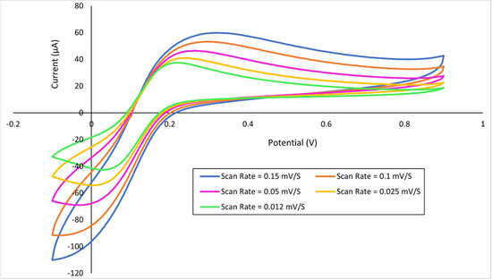 The peak potential (Ep) shifts slightly with changing scan rates. For reversible systems, this shift is minimal; however, for quasi-reversible or irreversible systems, significant shifts can occur due to the slower electron transfer kinetics not keeping up with the increased scan rates [69,70]. In this case, the potential shifts are indicative of the kinetic limitations of the system, where higher scan rates may result in peaks appearing at slightly more positive potentials for oxidation and more negative potentials for reduction. The scan rate also influences the shape of the CV curves. Higher scan rates, such as 0.15 mV/s, show broader peaks due to the increased capacitive currents and faster electron transfer kinetics. Conversely, lower scan rates, such as 0.012 mV/s, result in sharper peaks as the system has more time to reach equilibrium, reducing capacitive contributions and allowing more precise identification of redox processes. In addition, the scan rate affects the sensing information obtainable from the CV. Varying the scan rate provides insights into the electron transfer kinetics and whether the process is diffusion-controlled or involves adsorption. For instance, the peak current’s proportionality to the square root of the scan rate indicates diffusion control, while a direct proportionality would suggest adsorption control [71,72].